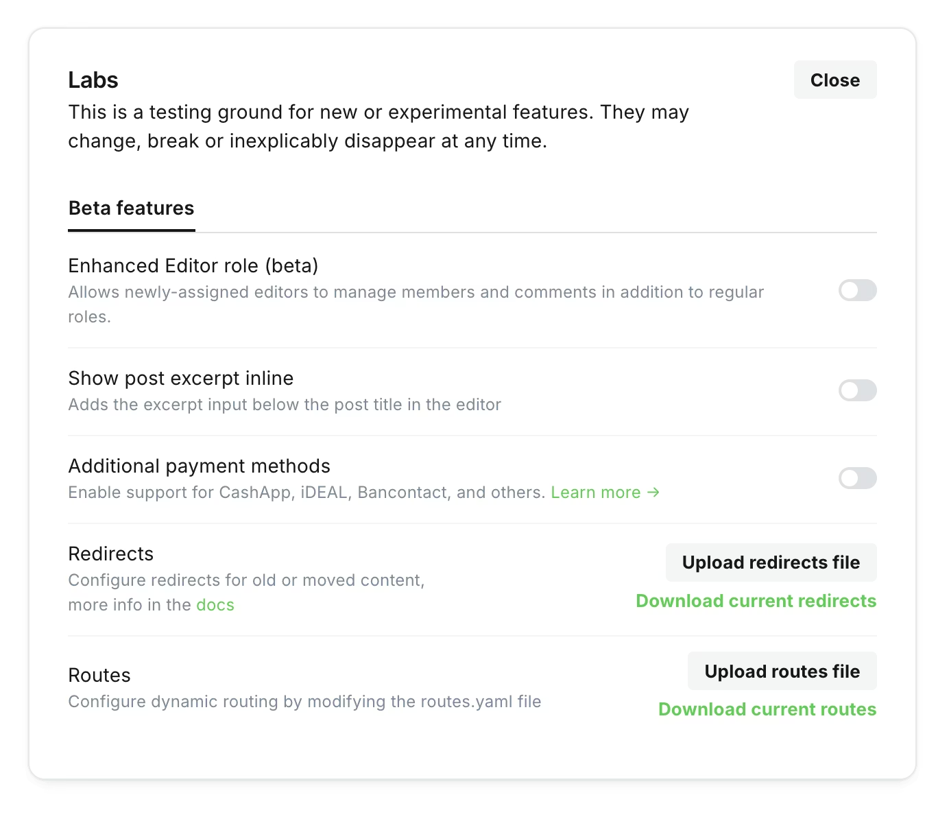 Tại trang Lab, click Download curent redirects để lấy file cấu hình. Tên của nó là redirects.yaml (hoặc redirects.json tùy vào phiên bản Ghost). Nếu bạn sử dụng routes tùy chình, ấn vào Download current routes.yaml để lấy file routes.yaml
