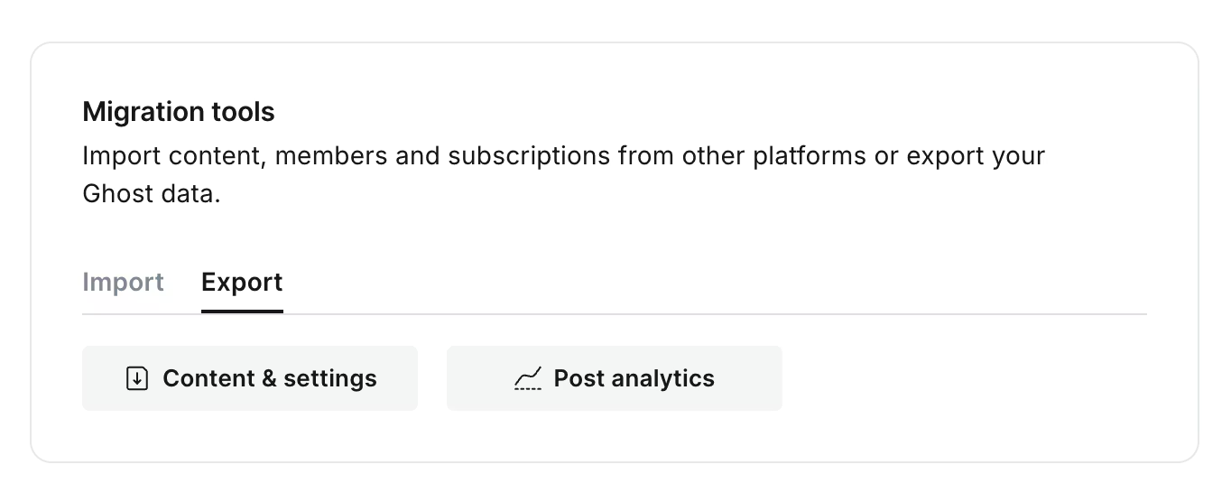 Đăng nhập vào Ghost admin trên trang của bạn và đến **Import/Export **-> Chọn Export sau đó click vào Content & settings để tải dữ liệu của bạn. Nó sẽ là file .json, với tên có dạng: my-site.ghost.2020-09-30-14-15-49.json